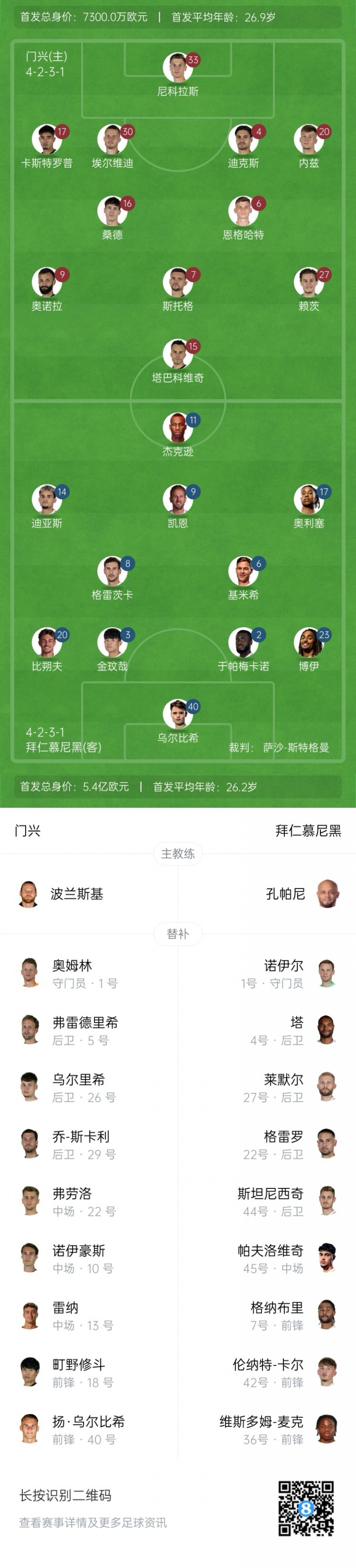门兴后备 :1-奥姆林、5-弗雷德里希、10-诺伊豪斯、13-雷纳、18-町野修斗、22-弗劳洛、26-乌尔里希、29-乔·斯卡利、40-扬-乌尔比希