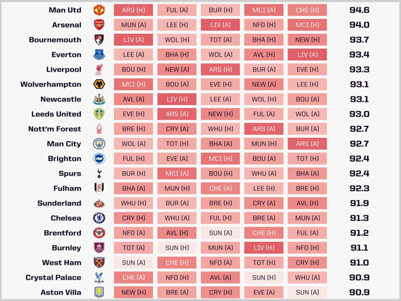 根据这套系统,曼联前五个对手包括阿森纳、富勒姆、伯恩茅斯、曼城和切尔西,五个对手的平均难度是最大的,高达94.6分,随后的阿森纳为94分,其中包括曼联、利物浦和曼城三个经典 豪门,最轻松的是阿斯顿维拉,只有90.9分,五个对手分别是纽卡斯尔、布伦特福德、水晶宫、埃弗顿和桑德兰。