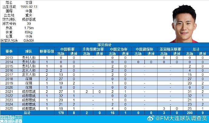 里程碑!成都蓉城中场球员甘超职业生涯各赛事出场200次