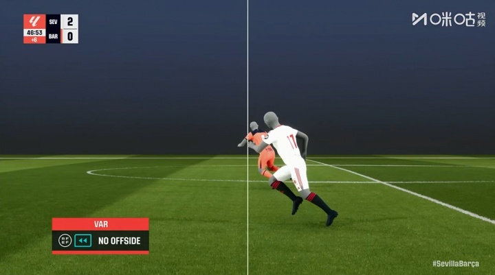 回放显示阿劳霍拖在了最后,塞维利亚攻击 球员并不越位违例 !