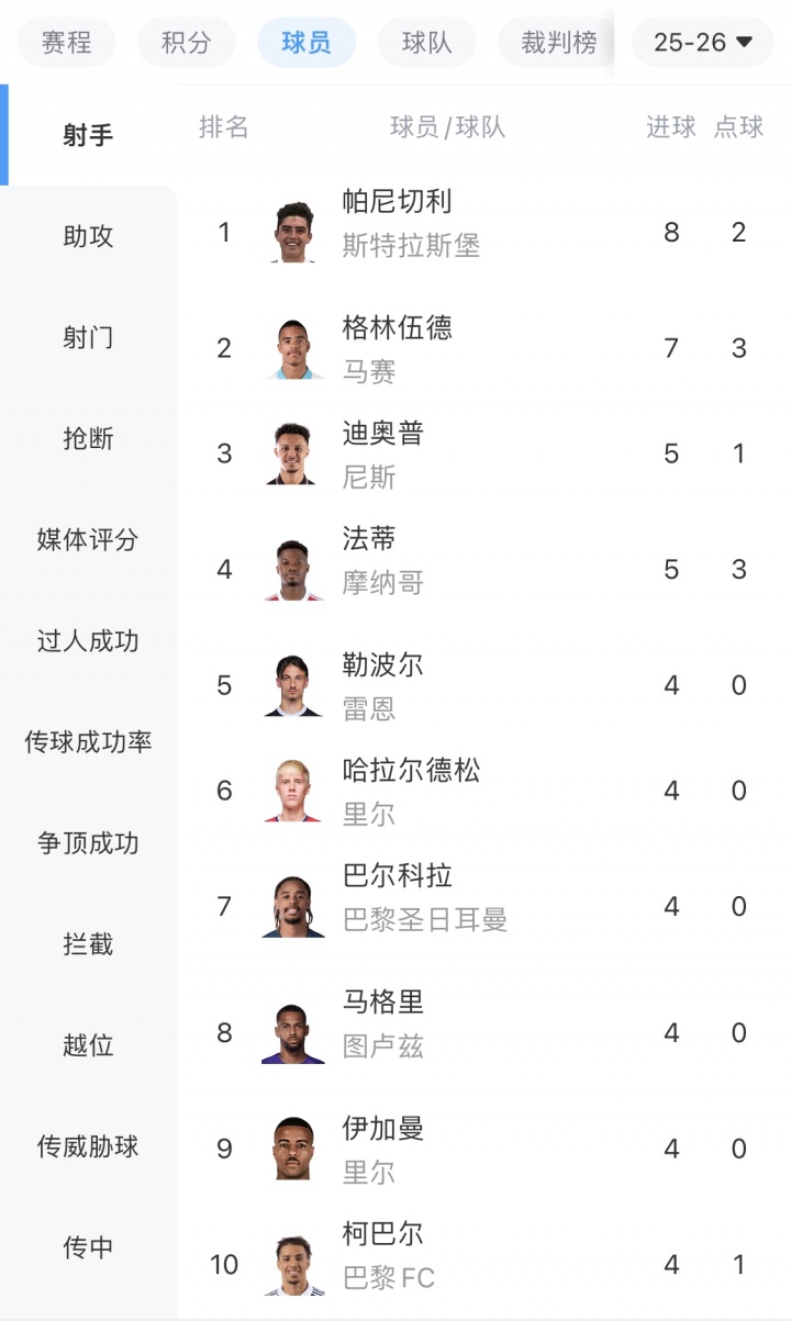 10月27日讯 法甲第9轮,斯特拉斯堡客场应战 1-2遭里昂致胜球 ,尽管输球,但阿根廷前场球员帕尼切利顶球破门,以8球领跑法甲射手榜,力压格林伍德。