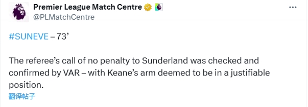 英超官方解释:“裁判 对桑德兰没有十二码球的判决 经过了VAR的检查和确认,因为基恩的手臂被认为处于合理位置。”