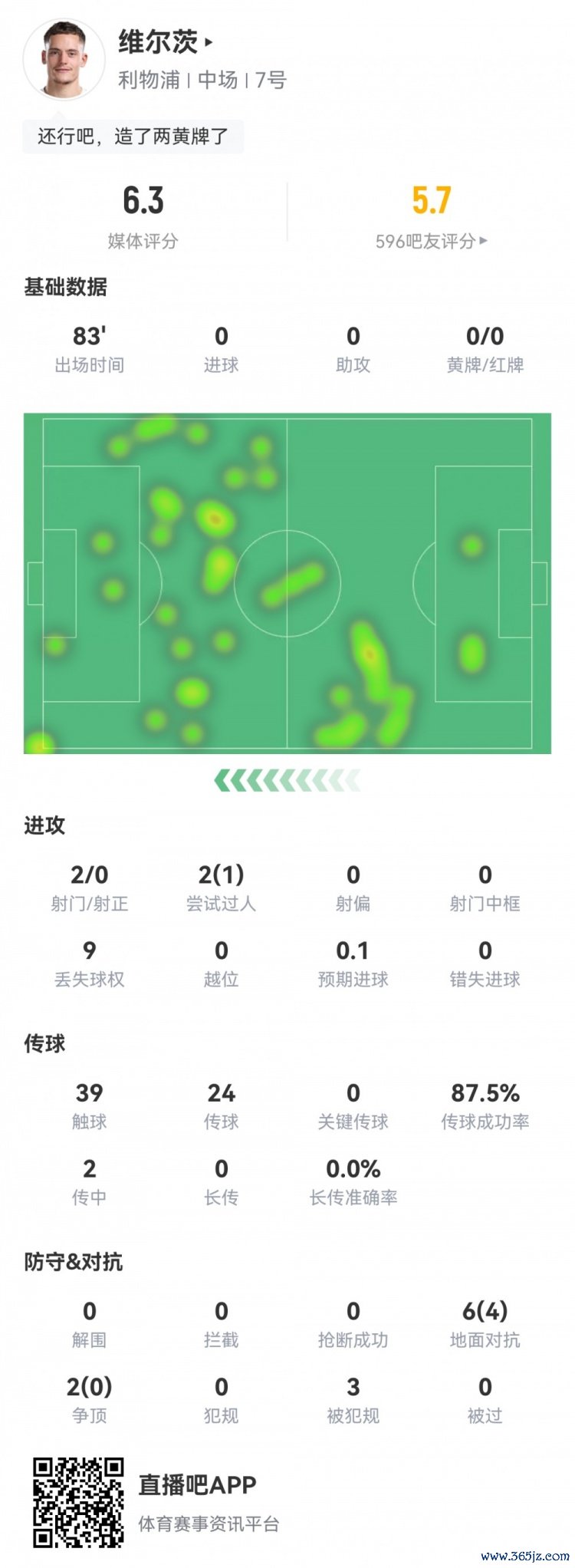 仅39次触球!维尔茨数据:2射0正,9次丢失球权,评分仅6.3