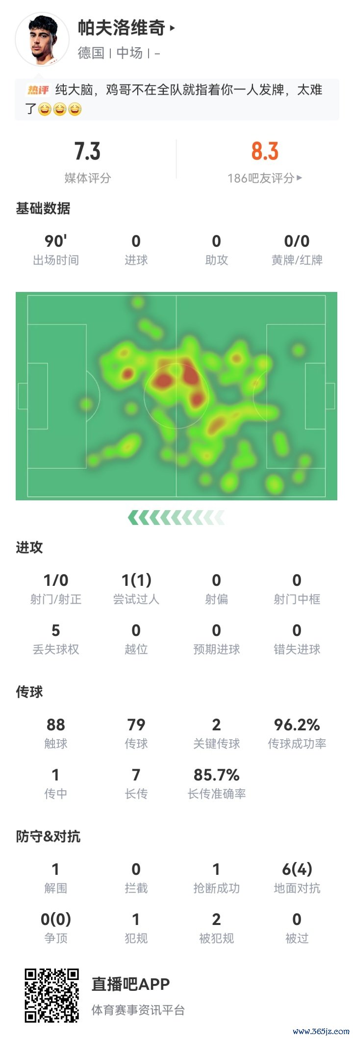 帕夫洛维奇已经连续3轮世预赛占据了德国队后腰的杆位位置,可以见得主帅纳格尔斯曼对他的信任。本场赛事 帕夫洛维奇表现不错,79次传送球 成功率96.2%,长传成功率85.7%,6次对峙 4次成功。
