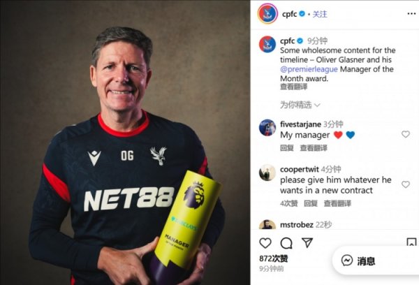 9月英超不败!水晶宫主帅格拉斯纳领取9月份英超最佳指导教练员奖
